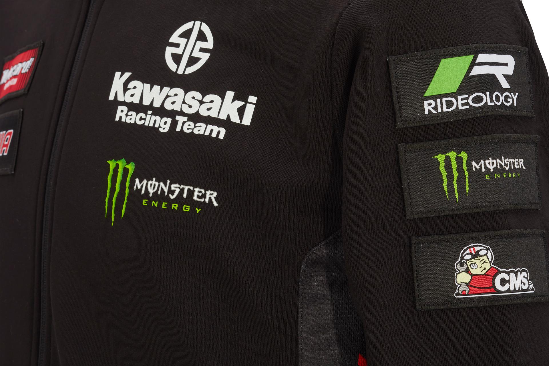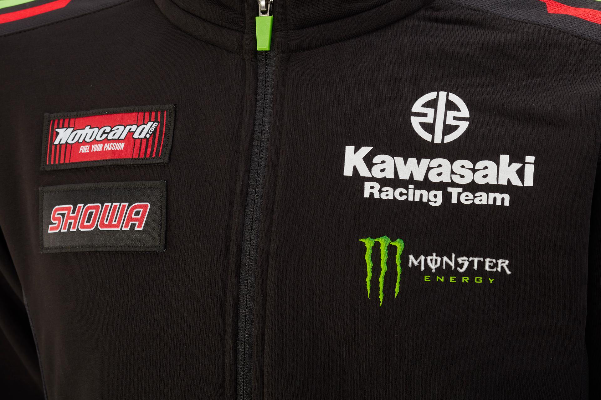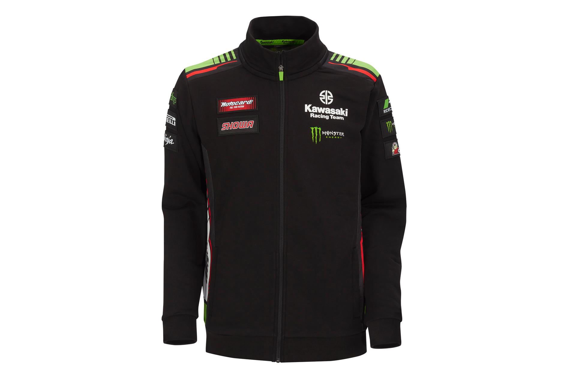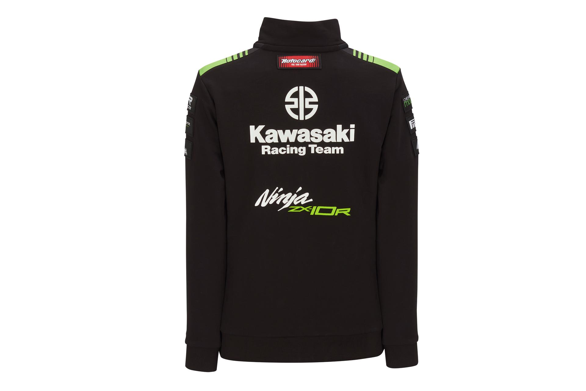 Zipped sweatshirt in Kawasaki WSBK team-colours with zipped outer pockets, standup collar and ribbed hem and cuffs.