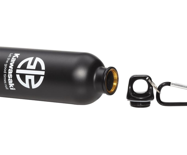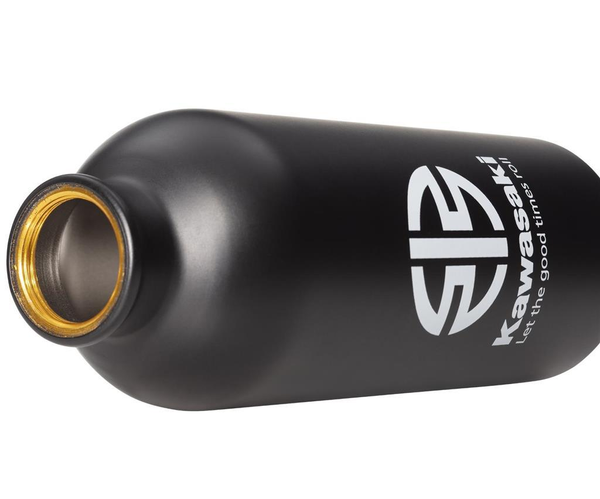 Kawasaki branded black stainless steel 500ml water bottle with screw top.