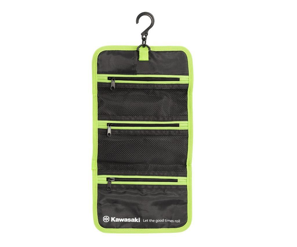 Roll-up toiletry bag with hook and three zipped compartments. Open dimension: 21cm wide x 40cm long